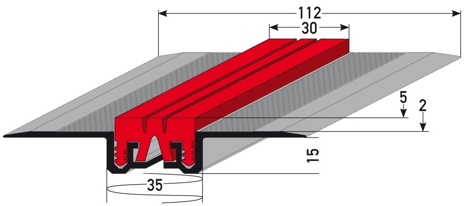 - GRÖSSE: Das Dehnungsfugenprofil verfügt über die Abmessungen 112 x 5 x 2000 mm und hat eine Einfasshöhe von 5 mm.