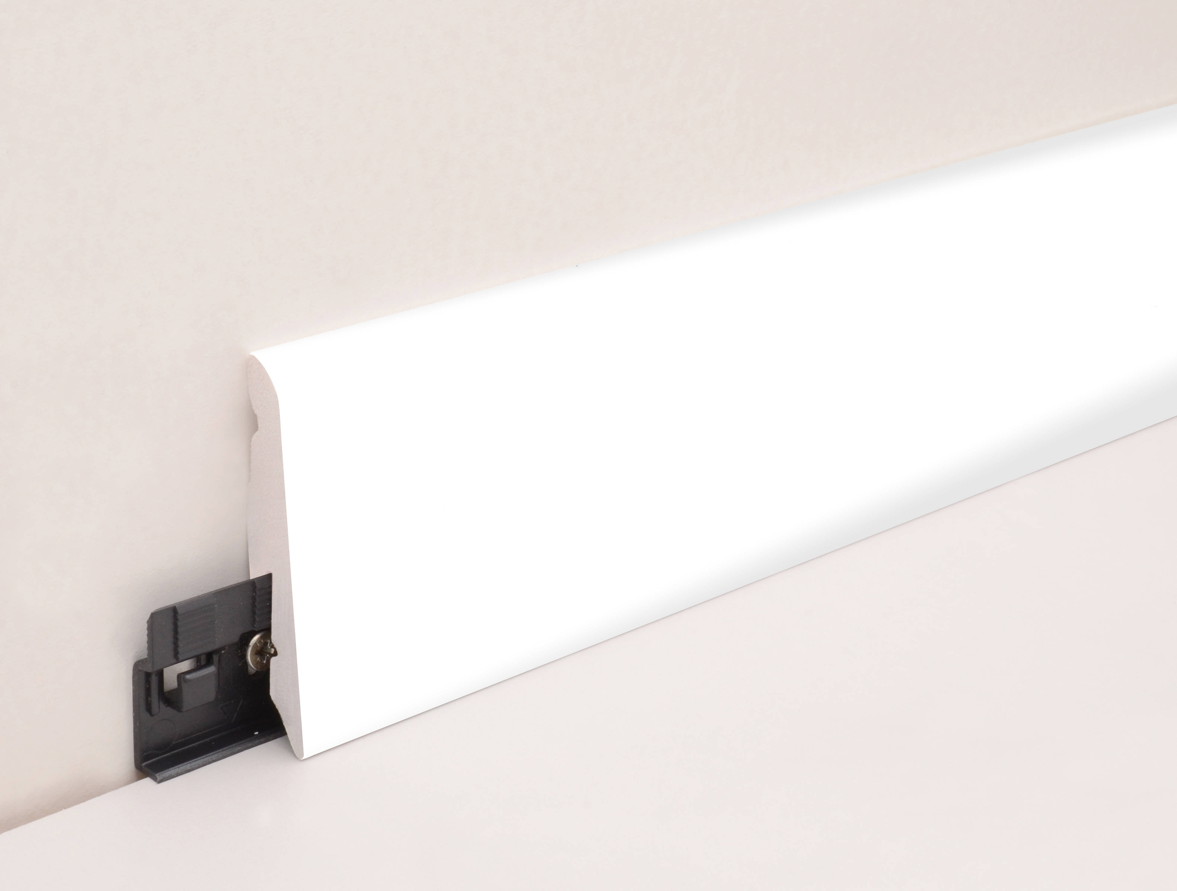 Eine passende Sockelleiste rundet den Bodenaufbau sichtbar ab und sorgt für einen sauberen Übergang zwischen Wand und Boden. Dieses Profil im Design KU014L verbindet eine klare Linienführung mit einer alltagstauglichen Ausführung in weiß.