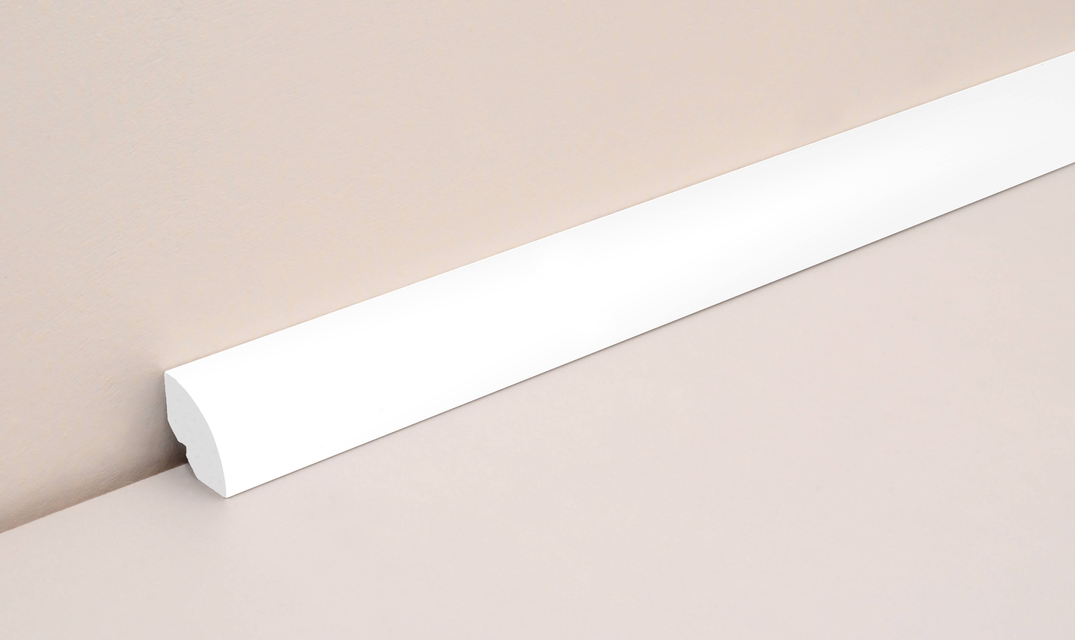 Ein Viertelrundstab setzt dezente Abschlüsse an Kanten, Fugen und Übergängen und sorgt für ein harmonisches Gesamtbild. Die Ausführung KU017OC in Weiß lässt sich vielseitig im Innenausbau einsetzen.